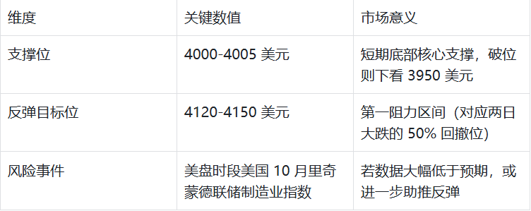经过两日累计超 7% 的跌幅,黄金 RSI 指标已跌至 30 以下超卖区间,且 4000 美元关口两次下探未破、21 日移动均线支撑稳固,符合 “急跌后超跌反弹” 的技术规律。High Ridge Futures 分析师在美盘前表示,“4000-4005 美元区间的承接力度超预期,短期底部或已形成,美盘大概率出现技术性回弹”。